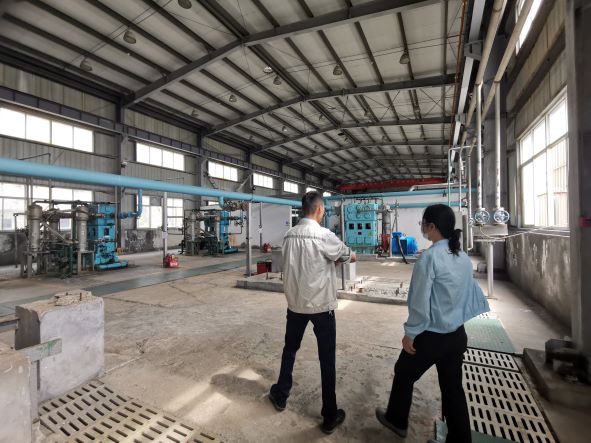 無(wú)錫市圣馬氣體有限公司舟山分公司專為金海智造股份有限公司配套供應(yīng)氧氣,地址位于舟山市岱山縣長(zhǎng)涂鎮(zhèn)仙草潭金海智造股份有限公司內(nèi),一期工程于2008年4月建成并投入使用,二期工程于2011年10月建成投產(chǎn),但2013年又拆除了原二期工程所安裝的空分設(shè)備(保留二期工程中5只100 m3中壓氧氣儲(chǔ)罐),目前有1套1500Nm3/h制氧能力的空分裝置,年制氧能力達(dá)到1178萬(wàn)N m3,大部分氧氣通過(guò)管道輸送至船廠用氣崗位,少量通過(guò)匯流排充裝至鋼瓶,供船廠零星用氣崗位使用(未安裝氧氣管道崗位),公司內(nèi)具備年充裝氧氣7.2萬(wàn)瓶的能力,公司現(xiàn)有職工8人。公司于2018年8月9日取得浙江省安全生產(chǎn)監(jiān)督管理局頒發(fā)的安全生產(chǎn)許可證證書編號(hào)為(ZJ)WH安許證字〔2018〕-L-0304,許可范圍:年產(chǎn)工業(yè)氧氣1178萬(wàn)Nm3、氧氣7.2萬(wàn)瓶。2017年12月21日取得浙江省質(zhì)量技術(shù)監(jiān)督管理局頒發(fā)的氣瓶充裝許可證,編號(hào)為TS4233704—2021,有效期至2021年11月2日。2020年6月8日取得危險(xiǎn)化學(xué)品安全標(biāo)椎達(dá)標(biāo)證書,證書編號(hào): ABQ IIIWH舟202000032,有效期至2023年6月。