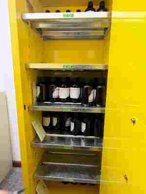 公司在實驗室做化驗實驗中需使用到易制毒、易制爆化學品:鹽酸、高錳酸鉀、硫酸、硝酸鉀、硝酸鉛、硝酸、雙氧水等,以上危險化學品包裝均采用試劑瓶的形式儲存在危險化學品中間倉庫內。除此之外,危險化學品中間倉庫內還涉及乙醇[無水]、乙醇溶液(95%)、乙腈、甲醇等危險化學品的儲存。
